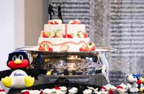そしてもうひとつのテーマは野球です!!ウェディングケーキにもこだわりたい!とおっしゃっておりましたおふたりが選んだのは大好きな野球ボール型のウェディングケーキ!パティシエと相談しながらデザインはボール型に!ウェディングケーキの前には大ファンのチームのキャラクターも飾り野球がいっぱいの空間に♪おふたりらしさ溢れるウェディングケーキにおふたりもゲストも大満足でした…♡