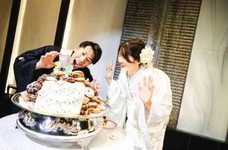 なんと結婚式当日はご新郎様のお誕生日☆彡 大大大好きなスイーツのドーナツタワーを用意し 会場にいる全員でバースデーソングのプレゼント! ドーナツはゲストの皆様にもお召し上がりいただきました 年齢のキャンドルとバースデークッキーは新婦様からのサプライズ!♡ ファーストバイトは『せーの』で同時に食べあいました♪