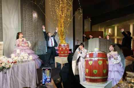 会場に現れたのは巨大な樽!!テーブル対抗でBIG黒ひげ危機一髪を行いました どのタイミングで中身が飛び出すのか、ドキドキ…ワクワク…! 金テープが勢いよく飛び出した瞬間には驚きと笑い声が重なり大盛り上がり!! 世代を問わず参加できる演出だからこそ 笑顔が広がり、忘れられないひとときに おふたりの「みんなで楽しみたい」という想いが、しっかりと形になった時間でした