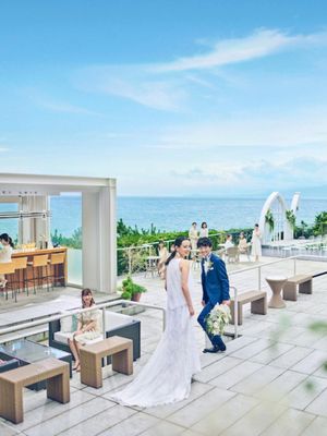 挙式までのひととき、ゲストはおだやかな海を見渡しながら、ドリンクや会話を愉しみ自由にリラックス。気ままに過ごせる開放的な空間で思い思いにお過ごしいただけます。