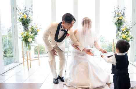 いよいよ挙式がスタートします。新郎様はお母様によるジャケットセレモニーでご入場。新婦様はお祖母様のエスコートにてご入場され、ご入場後にはお母様によるベールダウンセレモニーが行われました。皆様からの祝福の拍手に包まれる、あたたかなひとときとなりました。指輪交換の際には、かわいらしいリングボーイくんのお手伝いもあり、和やかな雰囲気の中で挙式が進んでいきます。
