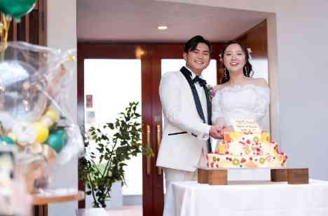 お式の後は、新婦様のウェルカムスピーチを合図にパーティがスタートします。会場ではご歓談も弾み、和やかな時間が広がります。ふんだんにフルーツを使用したこだわりのウェディングケーキで、おふたりによるファーストバイトも行われました。また、ご両家のお母様にもサンクスバイトが行われ、これまでの感謝をお伝えすることができました。