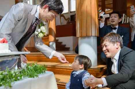 お子様ゲストも飽きずに楽しんでもらえるように、 ウェディングケーキ入刀のあとに、 ”お味見バイト”を行いました。 大きいケーキを前にお子様たちは喜んでくれました。 もちろん、おふたりのファーストバイトも素敵なシャッターチャンスとなりました。