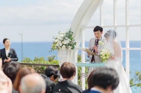 アットホームな雰囲気となるように、人前式を選びました。 綺麗な海が広がるガーデンチャペルで大切な方々の前で誓いを立てました。 子供たちやわんちゃんにもお手伝いしてもらいながら幸せな時間となりました。