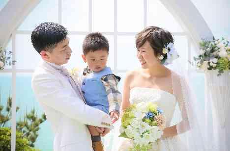 心地よいガーデンチャペルで挙式がスタート。 晴天に恵まれ、海がキラキラと輝いておりました。 お子様にリングボーイをしてもらったり、誓いのキスはおふたりからお子様にしたりと、アットホームな時間となりました。