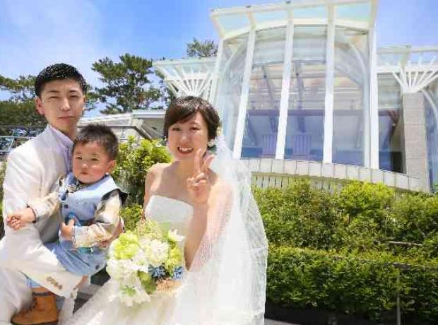 心地よいガーデンチャペルで挙式がスタート。 晴天に恵まれ、海がキラキラと輝いておりました。 お子様にリングボーイをしてもらったり、誓いのキスはおふたりからお子様にしたりと、アットホームな時間となりました。