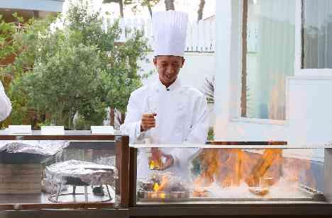 メインのお肉料理をご新郎様自らフランベをし、仕上げて頂きました。ゲストからは歓声があがり、笑顔いっぱいのパーティーとなりました。 会場の扉が開放的に開き、ウッドデッキが広がる披露宴会場ですので、お料理の良い香りや海からの心地よい風も感じながら贅沢に過ごして頂けました。