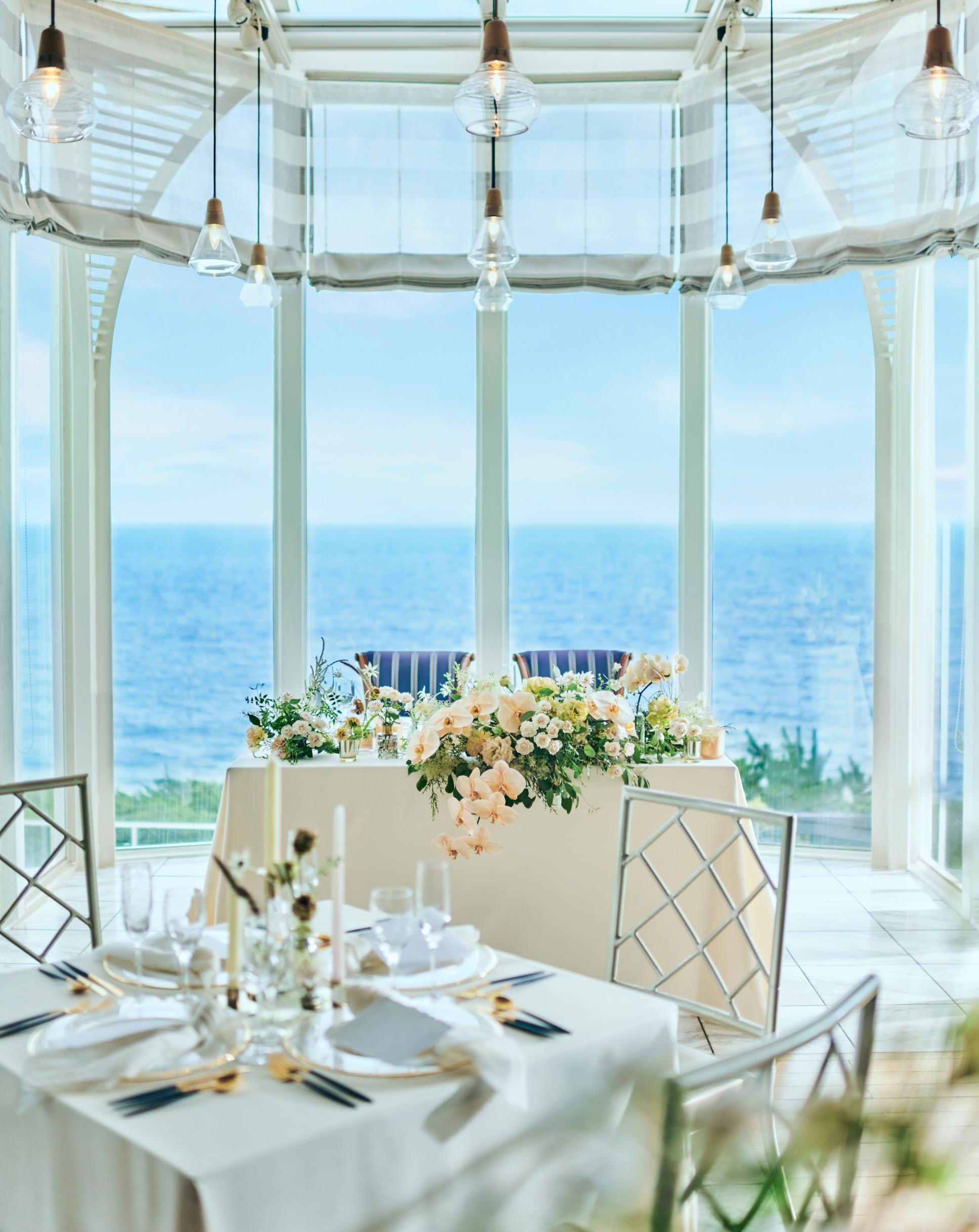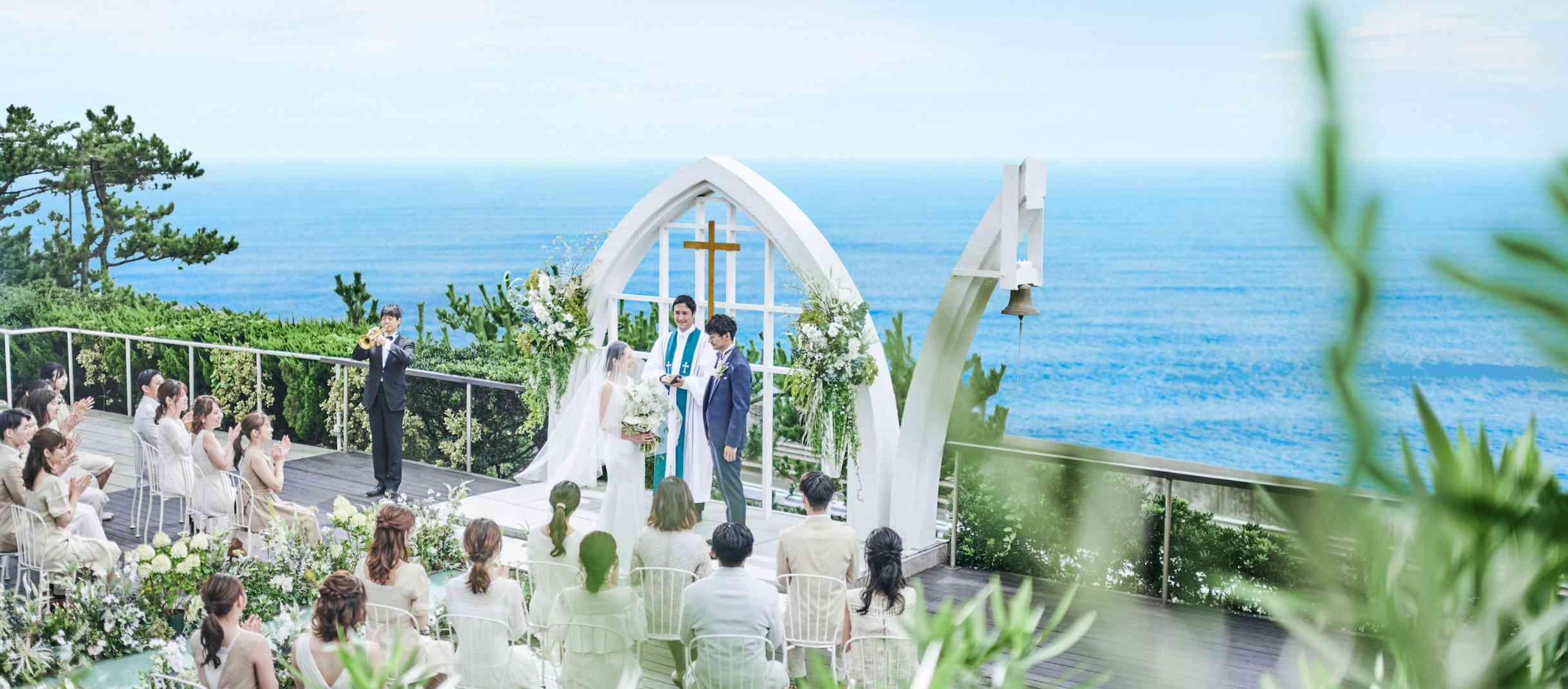 遮るもののないオーシャンビューがふたりとゲストをお出迎え。潮風を肌で感じられるオープンエアな空間に、ふたりを祝福する音色が遠く海へ響き渡ります。