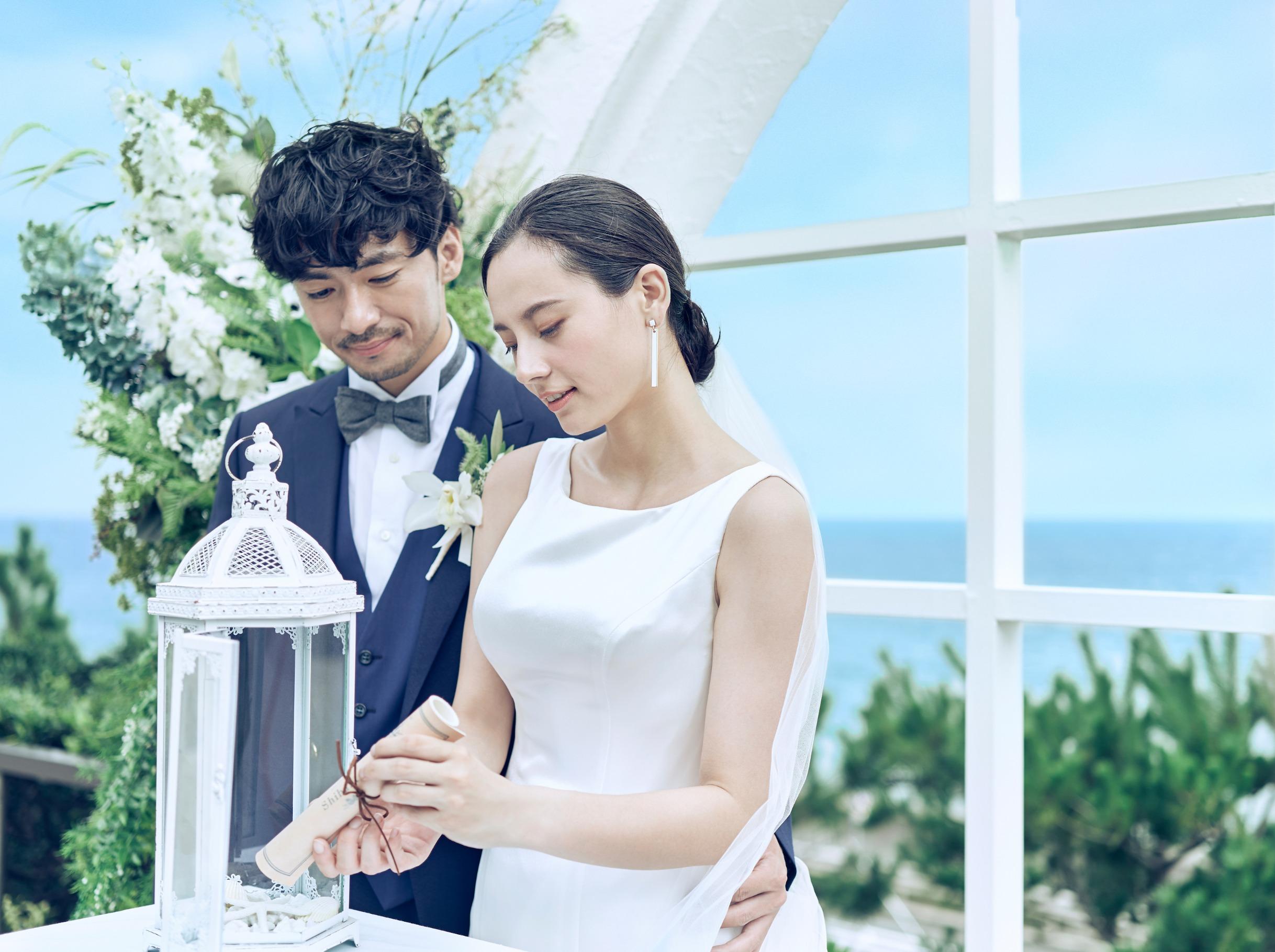 どこまでも続く水平線とコバルトブルーのグラデーション。清らかな空間にゲストからの温かな祝福があふれます。ふたりの門出を明るく照らすランタンを模したウェディングセレモニーにも注目。
