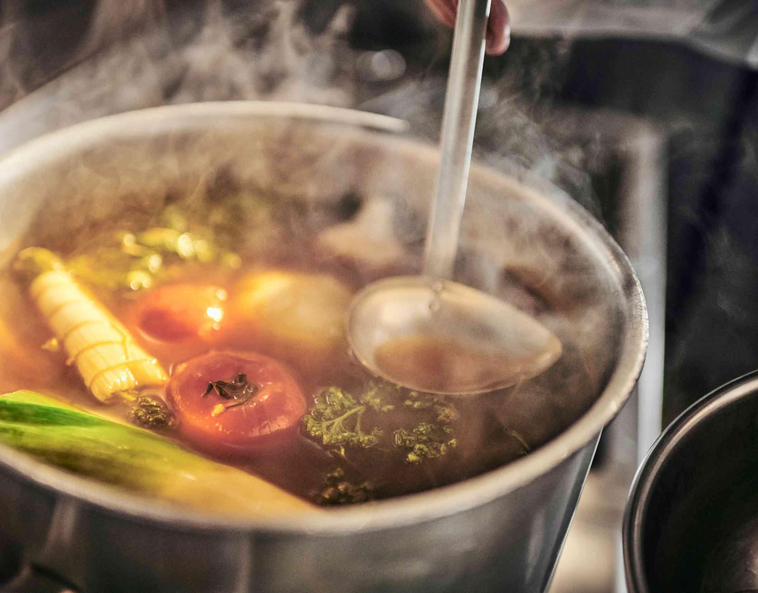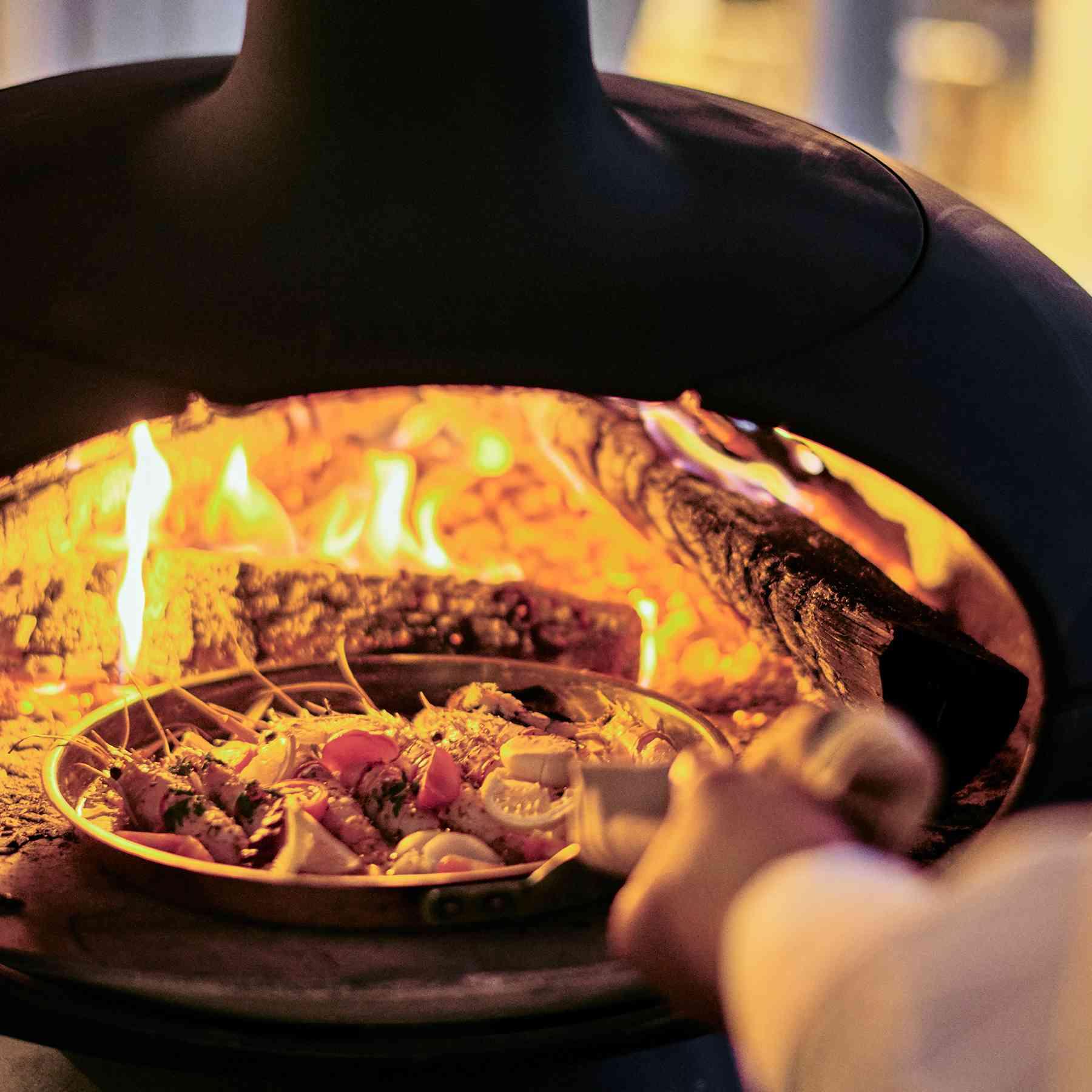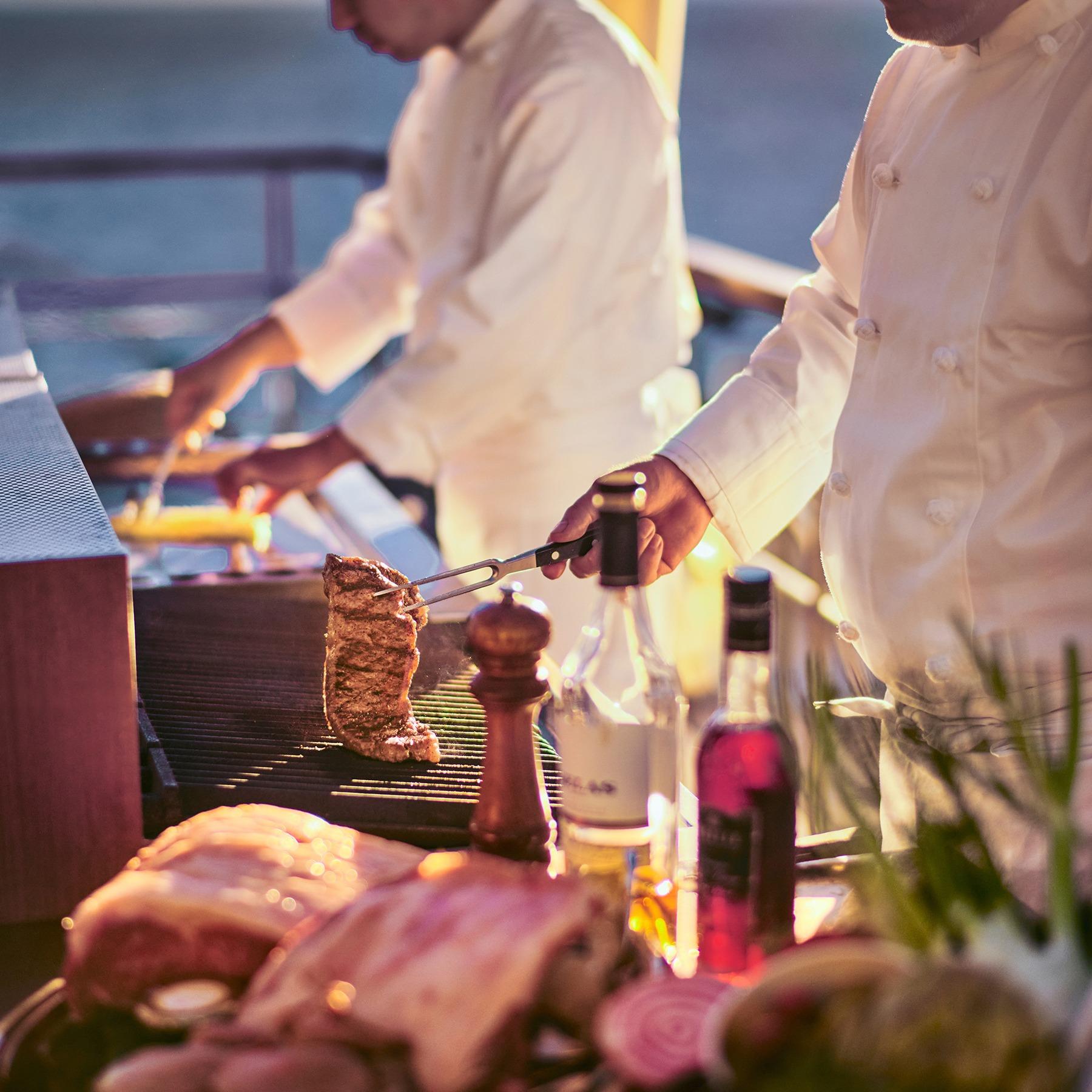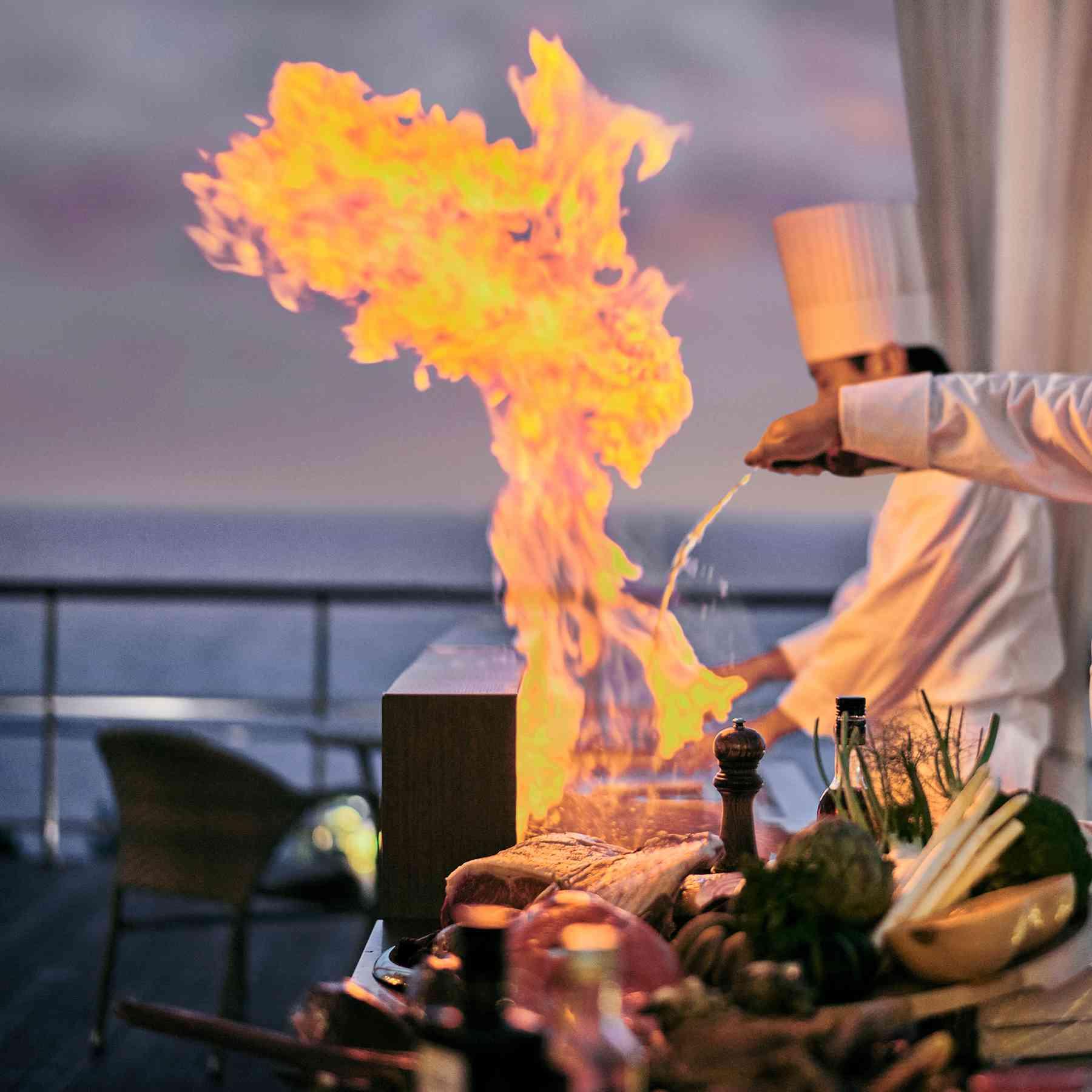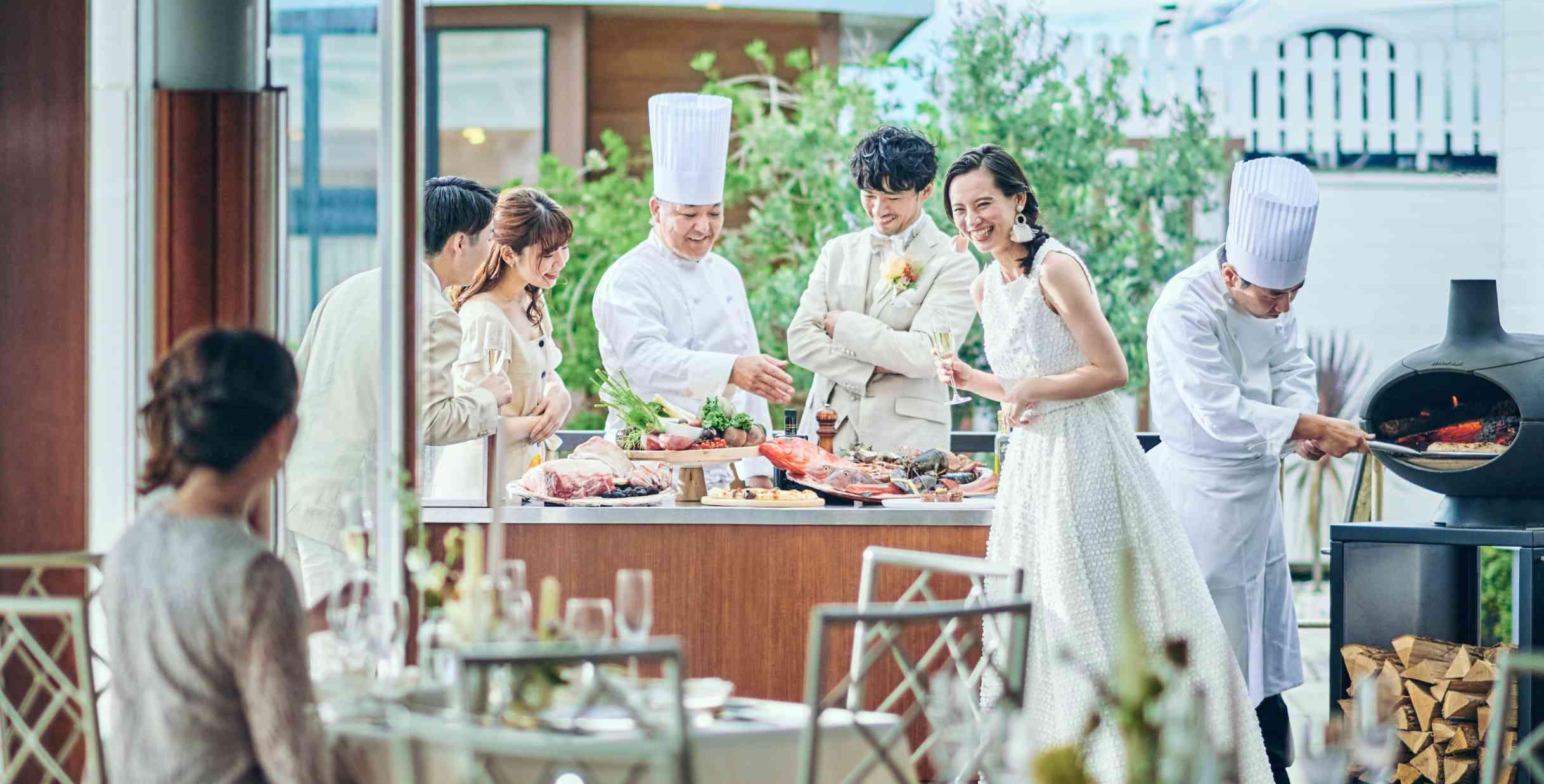 シェフがゲストの目の前でお料理をサーブする贅沢で特別な時間。パーティ中盤、ゲストの歓声とともに高く上がる炎のフランベが魅力の一つ。想い想いの場所で出来たてのお料理やゲストとの歓談を楽しんで。