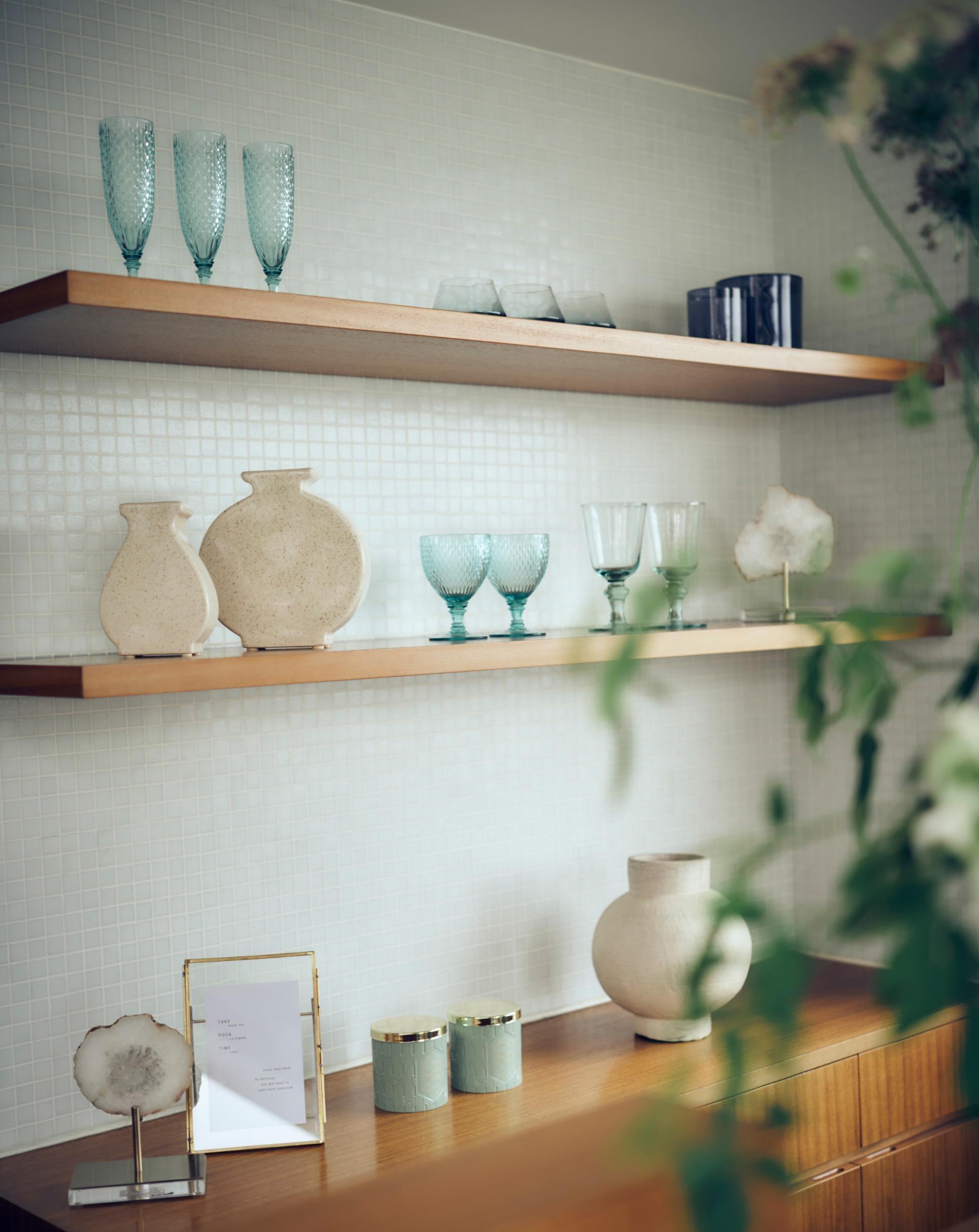 カジュアルでありながらもこだわりを感じられる上質空間。カウンターに並べられた爽やかなウェルカムドリンクが、非日常の贅沢さを感じさせてくれる。貸切邸宅でのリゾートステイをお愉しみください。