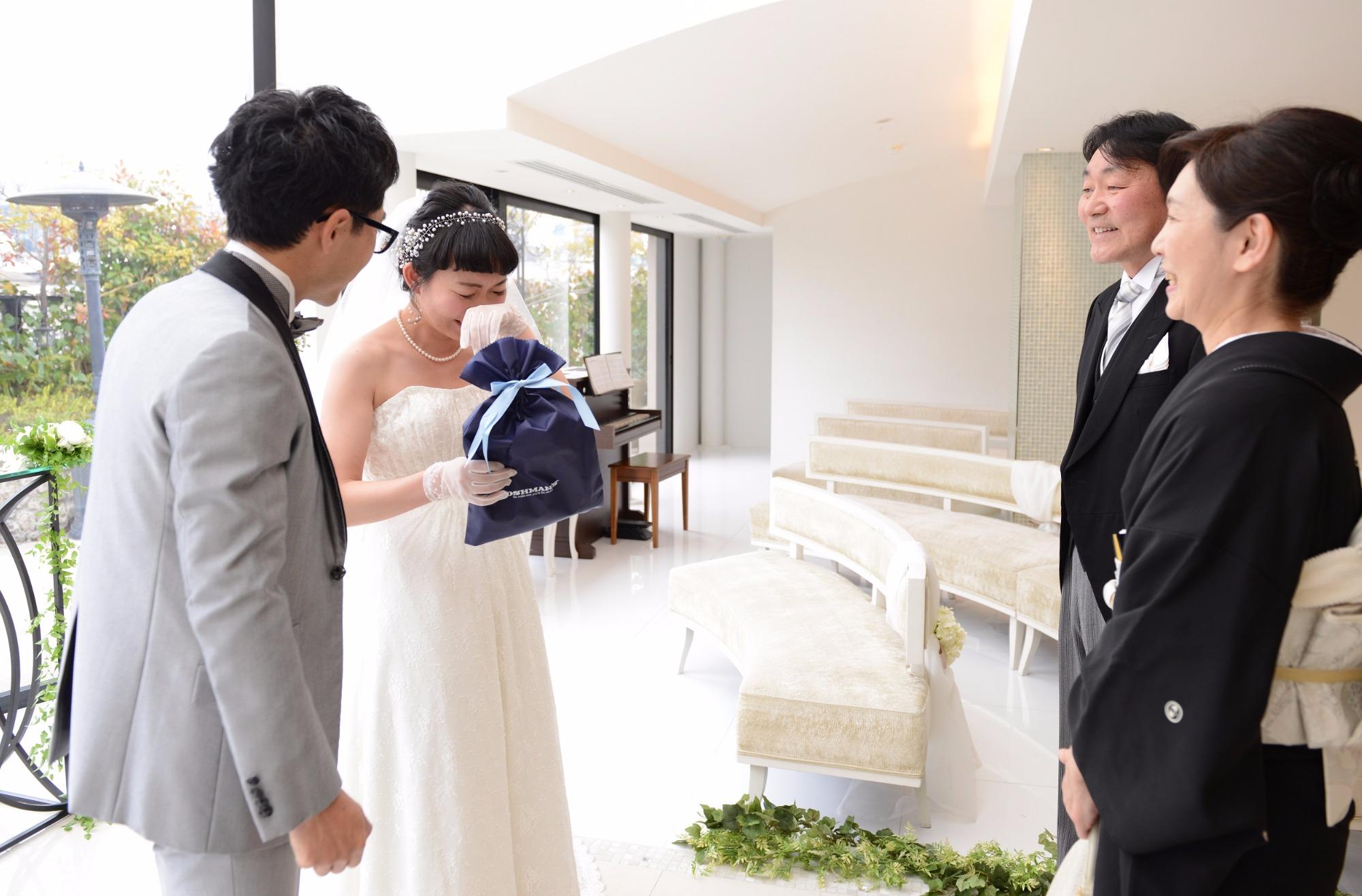 挙式はゲストに参加してもらいたい、という想いから人前式にしたお二人。お二人で考えられた誓いの言葉を述べた後はウェディングツリーにサインをして完成! 実はこの日、お誕生日が近いお父様を挙式前にチャペルへお呼び出ししてサプライズでバースデープレゼントをお渡しされました。 ルシェルブランでは1件貸切だからこそ、挙式の前にこういった家族だけの大切な時間もお過ごしいただけます。