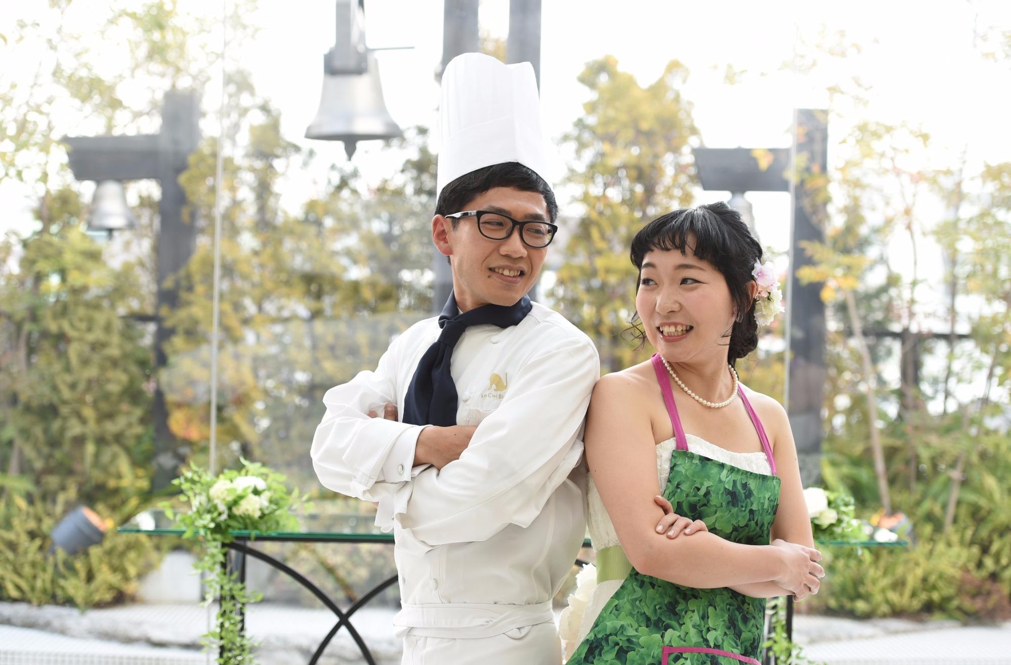お二人の為に集まって頂くご友人・ご親族の皆様へ、お二人からのおもてなしの気持ちを表したい…という事で取り入れたシェフズダイニングは、ゲストの皆様にも大好評! コックコート姿の新郎がフランベで仕上げたお肉料理を、エプロン姿の新婦と共にお一人お一人へおm手無しの気持ちを込めてサーブしました。