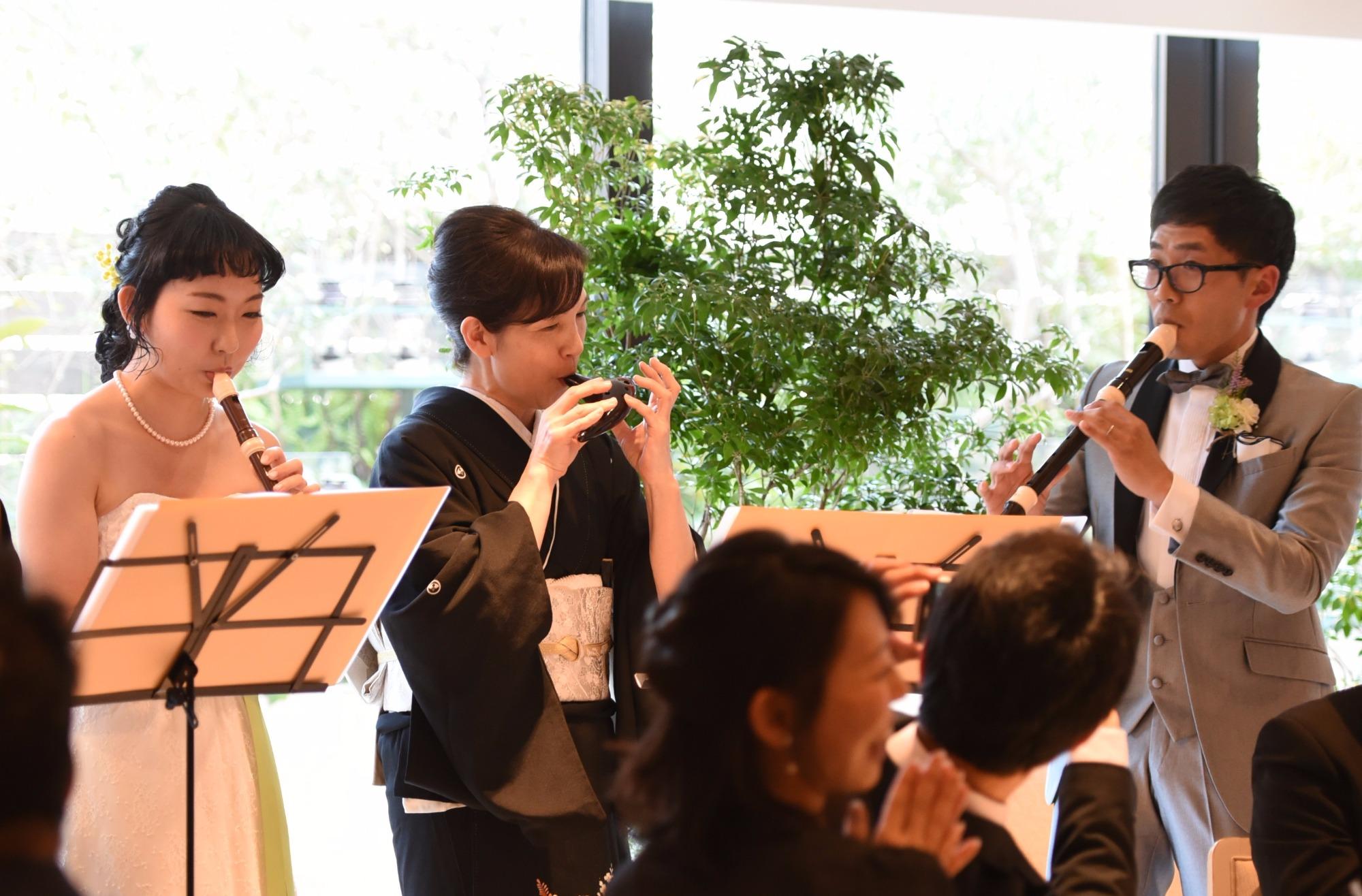 パーティーの締めくくりにはお母様が日ごろ習われているオカリナの演奏タイムが。 新郎新婦もこの日の為に練習してきたリコーダーで飛び入り参加! ご家族との仲の良いお姿にゲストの皆様からも温かい祝福の声と笑顔のあふれる、お二人らしいパーティーとなりました。