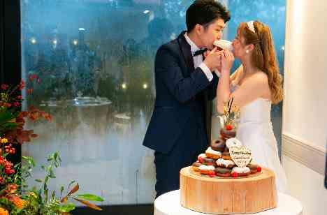 ウェディングケーキも普通のケーキではなく、ゲストに楽しみながら喜んでもらいたいなということでおふたりが選んだのはたくさんのドーナツを積み上げた『ドーナツタワー』。たっぷりのチョコレートがかかったあま〜い♡ドーナツでファーストバイト!!ゲストのみなさまからも『可愛い〜!!美味しそう〜!!』と大好評でした♪