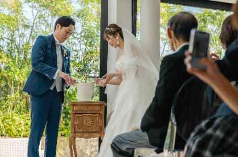 良く晴れた秋の朝。 キャットストリートの賑わいはとても届かないビルの上の隠れ家で、ゲストへの想いが詰まった一日がスタートしました。 挙式のお時間までゲストにお待ちいただいている間、「夫婦の樹」「幸せを運ぶ樹」と呼ばれるオリーブの苗を植える「植樹式」の演出をご準備されました。 ゲスト皆様に土を入れてもらえるよう、アナウンスも工夫されました。