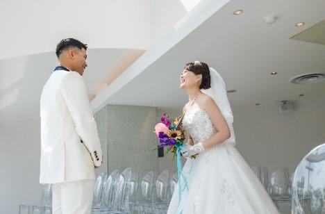 夏のご結婚式にふさわしく晴天に恵まれた当日。 好きなものがたくさん詰まった素敵なパーティ。 『海』をテーマにされたおふたりは、ウェルカムスペースやペーパーアイテムで夏らしさを取り入れられました。 お仕度を整えてドキドキのファーストミートも。 顔を合わせた瞬間自然と笑顔が溢れていました…♡ お写真カットも残るので人気演出の1つです。