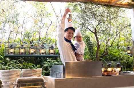 パーティ後半では、新郎様によるフランベ演出をゲストの皆様にサプライズをする為、コックコートにお着替え! お子様もおそろいのコックコートを着て登場しました! 会場内はサプライズ溢れるイベントに盛り上がりも最高潮。 フランベされたお肉は牛フィレ肉へグレードアップし、ゲストの皆様におもてなしをされました。