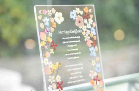 よりお二人らしい式になるようにとオリジナルの結婚証明書を用意しました♪お二人の好きなデザイン・人前式だからこそ温かみのある雰囲気が伝わるようにとご用意されました。式のあとには、パーティ会場にも飾られゲストからも「これがさっきの結婚証明書だ!」「かわいい!」などの声が飛び交いました。