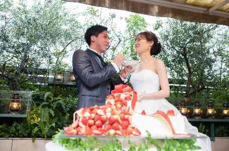 プレゼントボックスから苺が溢れ出すような可愛らしいウェディングケーキ。ご新婦様のこだわりが詰まったデザインです!オーダーメイドでお作りした、世界でひとつだけのウェディングケーキはゲストの皆様からも「かわいい!」と大好評でした。