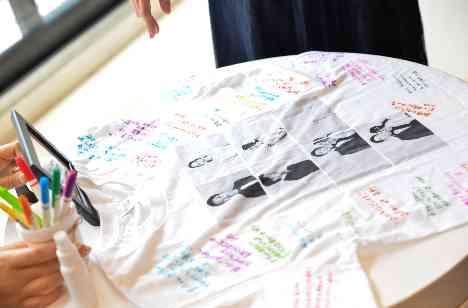 結婚式の想い出を何か形に残したい!とおふたりのお写真入りTシャツに、ゲストの皆様からメッセージを集めました!”どこに書こうかな、何を書こうかな”とゲストの皆様もとっても楽しんでいました♪ご結婚式後もご自宅に飾れる大切なアイテムの完成です!