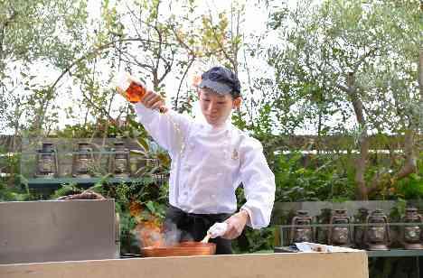 学生時代のアルバイト先で出会ったおふたり。お肉料理の仕上げをするためコックコート姿で登場したご新郎様が身に着けているのは…懐かしのアルバイト先の帽子!ご新郎様が登場した瞬間、当時ご一緒にアルバイトをされていたご友人様はこのサプライズに大盛り上がり!大きな炎を上げてお肉料理の仕上げをしてくださいました☆
