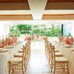 大きな窓から差し込む光と、テラスのグリーンが自然と寛ぎを感じる会食会場。緑を背景にふたりのソファ席をオシャレに飾ったり、テーブルレイアウトを自由にアレンジしたりと、人数や進行内容によって、会場内をふたりで決められるのも魅力のひとつ