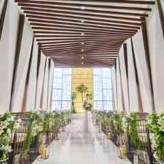 【天井高7mの上質チャペル】開放感とデザインが印象的な空間は厳かなキリスト教式から、ゲストに証人になっていただく人前式まであらゆる形にフィットする。ソファ席なのでゲストもゆったりとご着席いただけます。
