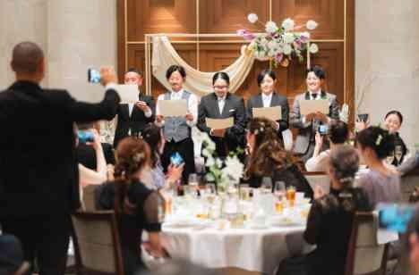 一番こだわった演出が新郎さまのご中座です! 5人兄弟末っ子である新郎さま 兄たちの結婚式での中座はすべて5人兄弟で行ってきました そして今日が最後の結婚式 一緒に考えた中座方法は、5人兄弟みんなで両親へ向けた卒業式 兄弟も会場も1つになり、とても盛り上がる、そして忘れられない時間になりました