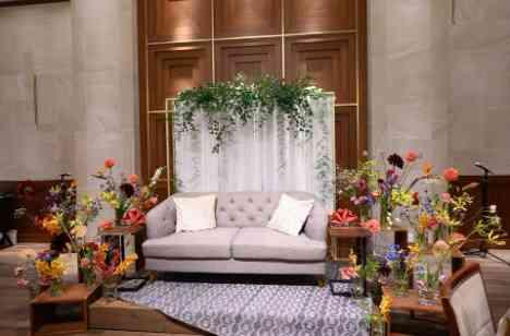 お花が大好きな新婦様は会場装飾にもこだわります♪ ゲストテーブルの装花だけではなく、メインの高砂の装花、ブーケ、ウエディングケーキ、ウェルカムスペース、ヘアメイクとおふたりのハレの舞台を華やかなお花で飾ります 1組貸切邸宅をおふたり色に染め上げ、新婦様の理想通りのおしゃれで可愛いパーティ会場になりました