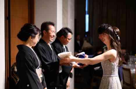パーティ最後の演出は両親への記念品贈呈 憧れである両親、そんな両親の元で今日まで大切に育ててくれた感謝を込めて、新郎新婦様が生まれたときの体重を模した体重米を贈りました 贈呈の前には、親御様からおふたりへ向けた「ふたりが生まれたときの想い」を司会者から代読 自身をはぐくんでくれた家族へ感謝を伝え、これからは自分たちで新しい家族をつくっていくはじまりの日となりました