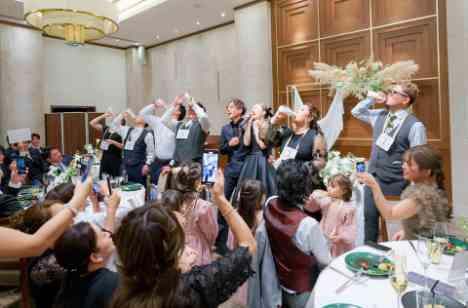 友人スピーチ、ご中座、お手本バイトにゲーム演出と、パーティでは沢山のご友人、お子さまにご参加いただき、会場の一体感がでた時間でした もしご友人がいなかったら、今の私たちはいない!とおっしゃるくらい大切にされている方々との楽しいお時間におふたりも時間をわすれ、心から楽しまれているのが印象的でした