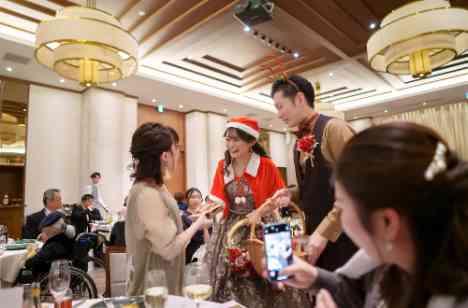 ブーケや会場装飾もクリスマス感たっぷりの世界観! お色直し入場時には新郎がトナカイ・新婦がサンタさんの小物を付けてご入場されたおふたり♪ デザートブッフェもクリスマスをテーマに準備し、イチゴのサンタさんが華やかに彩ります* クイズやテーブルフォトラウンドなど盛りだくさんのパーティとなりました
