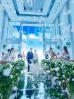 | 挙式スタイル | 教会式/人前式/和装人前式 ■空に浮かんでいるような『クリスタルスカイチャペル』■ 天井高約7m、バージンロードは約10mという壮大なスケールのチャペル。 最大130名までご着席可能で、たくさんのゲストを挙式からご招待いただけます。 2フロア吹き抜けの大きな窓には青空が広がり、緑が自然光を受けて輝く開放的なチャペル。 白を基調した館内には自然光が溢れ、明るく輝きに満ちた空間です。 長いバージンロードにロングトレーンのウエディングドレスがよく映え、ゲストの皆さまにもしっかりとおふたりの晴れ姿を見守っていただけます。 青空と雄大な眺望を背景に祭壇に立つおふたりの姿は、まるで空に浮かんでいるよう。 自然光と緑、そして青空に囲まれた純白の空間が、おふたりの誓いの時を演出いたします。 |