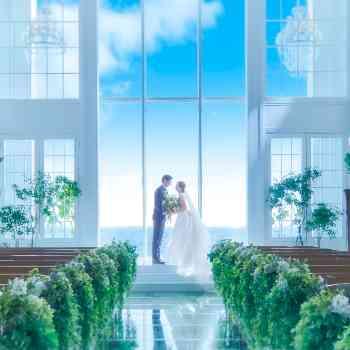 教会式/人前式/和装人前式 ■空に浮かんでいるような『クリスタルスカイチャペル』■ 天井高約7m、バージンロードは約10mという壮大なスケールのチャペル。 最大130名までご着席可能で、たくさんのゲストを挙式からご招待いただけます。 2フロア吹き抜けの大きな窓には青空が広がり、緑が自然光を受けて輝く開放的なチャペル。 白を基調した館内には自然光が溢れ、明るく輝きに満ちた空間です。 長いバージンロードにロングトレーンのウエディングドレスがよく映え、ゲストの皆さまにもしっかりとおふたりの晴れ姿を見守っていただけます。 青空と雄大な眺望を背景に祭壇に立つおふたりの姿は、まるで空に浮かんでいるよう。 自然光と緑、そして青空に囲まれた純白の空間が、おふたりの誓いの時を演出いたします。 この会場は挙式のみご希望のお客様のご予約を受付することができません。 もし披露宴を行わず挙式のみをご検討中の方はこちらを御覧ください。 |