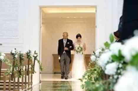 バージンロードに敷き詰められた緑はウェディングドレス姿をより一層ひき立ててくれます。 チャペルの扉が開きお母様からのベールダウン。その後、エスコート役のお父様の手をとりバージンロードへ。 今日という日を楽しみにされていた親御様。お父様は新婦様とバージンロ―ドを歩みながら様々な想いがこみ上げ、感激のあまり涙を流されておりました。お二人の晴れ姿のお披露目は大成功♪