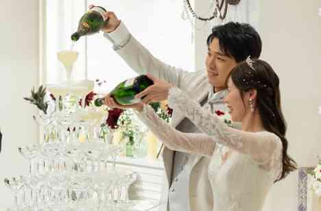 ケーキ入刀ではなく、おふたりの共同作業はなんとシャンパンタワーを!たくさん積み上げられたグラスの上からシャンパンが注がれて満たされていく様子は、とても華やかかつ幻想的でロマンティックです♪ゲストの皆様もあまり見ない演出に興味津々!前に出ていらっしゃり、たくさんのお写真を撮影をされていて大好評でした♪