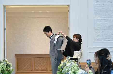 挙式の入場シーンでは新郎様の親御様にお手伝いいただきジャケットセレモニーを。お母様にジャケットを着せていただき、お父様からはグローブをお渡しいただきました。お支度が結び、バージンロードを歩きだす新郎様を送り出す親御様の表情はとても優しく、そんなセレモニーの始まりの瞬間をゲストの皆様もあたたかく見守ってくださりました。