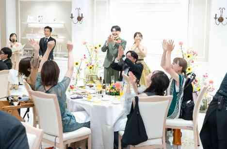 お色直し後は全員参加型のゲームを二つ企画! ひとつめは盛り上がること間違いなしの王道『ドレス色当てクイズ』、ふたつめは職業にちなみ、教育用ゲームアプリを使用したクイズ大会です。どちらも景品を賭けて皆様のボルテージは急上昇。特にクイズ大会はチーム対抗だったこともあり、ゲスト同士がハイタッチで盛り上がる姿も♪まさにおふたりが大切にされていた『ゲストに楽しんでいただくこと』が形になった演出でした!