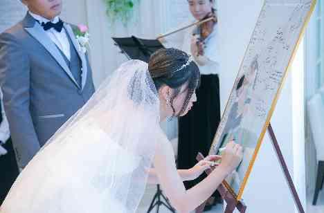 結婚証明書にご用意されたのは、前撮りの際に撮影された新郎様が新婦様を抱き上げたポーズ写真のボードです。受付の時間にゲストにはメッセージを自由に書いていただき、挙式本番で新郎新婦様が皆様の前でそのボードにサインをされました。 挙式が結ばれた後は披露宴会場のウェルカムスペースにも飾られ、皆様の印象にも残りやすいアイテムのひとつになったのではないでしょうか♪