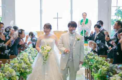 自然光が煌めくクリスタルスカイチャペルでキリスト教会式を執りおこなったおふたり。牧師に優しく見守られながら神聖な雰囲気の中愛を誓い合い、ゲストの皆様もあたたかく静かにその瞬間を見守りました。 そして退場のシーン。ゲストからの祝福のバブルシャワーのシャボン玉が七色に光り、より幻想的な空間を演出。おふたりも無事に挙式が結び、ほっとした様子で笑顔で応えておりました。