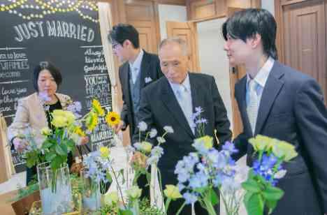 ご披露宴の始まりに新郎新婦様が用意されたのはフラワービュッフェ♪ ウェルカムスぺ―スにゲスト全員分のお花が用意され、ひとりひとりにテーブルに飾るお花を選んでいただきました。披露宴が始まるまでの待ち時間も楽しく過ごしていただきたいという新郎新婦様の想いと、新郎新婦様自身も入場の瞬間まで会場内がどんなお花で彩られているのか楽しみになる、わくわくする素敵な演出でした。