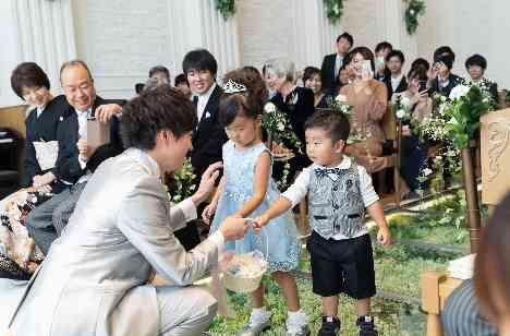大切なゲスト様に迎えられ、ご入場されたおふたり。ご新婦様のお母さまがリングピローをお手作りされ、おふたりの元へ届けるのはご新婦様の姪御さまと甥御さま♡キュートなお子さまゲストの登場に会場は笑顔に包まれました♡皆さまとの絆が感じられる温かい挙式となりました。