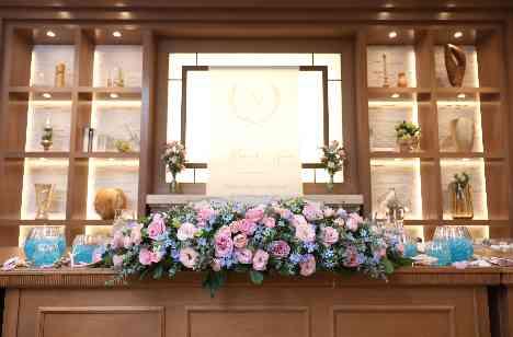 とある人気キャラクターが大好きなお二人。ピンクと水色を中心にコーディネートをされました。 ケーキもピンクと水色でグラデ―ションケーキに、テーブルラウンドは海をイメージし、ウォーターマジックを選ばれております。
