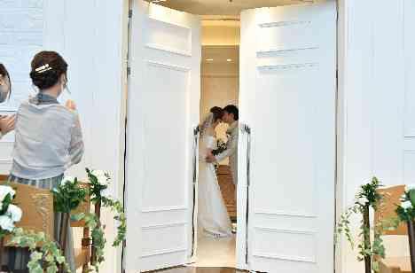 お子様方によるリングセレモニーをはじめ、ブーケプルズなど内容盛りだくさんの挙式。 一番の見せ場は挙式退場の瞬間。 扉が閉じる際に、クロージングキスを行いました。 ゲストの方もその瞬間を逃すまいと、お写真を撮影する手が止まりません!