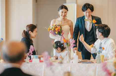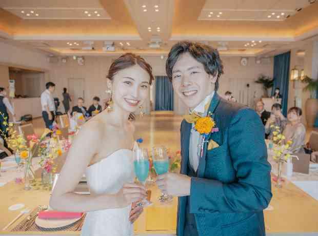 日常にも、話にも、スマイルにも、人生にも花を! 来てもらう方たち皆様を照らす、太陽のようにカラフルなお花を咲かせるスマイルにしたいと思ったからです。 また、披露宴会場のLINOから見える海の景色もとっても気に入りました。LINOは青を基調としていてカラフル装花の一部として馴染みそうだと思い選びました。