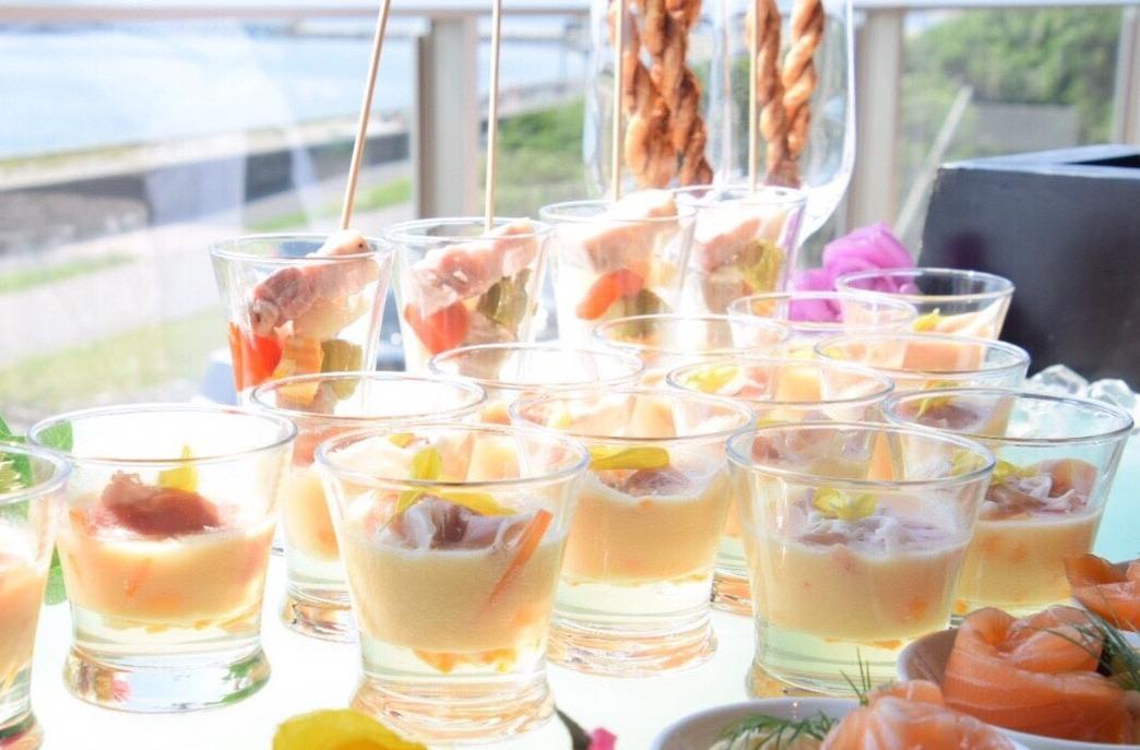 ゲストに座っていて欲しくない!食べて、飲んで、笑って、楽しく過ごしてほしい。という思いから前菜を個々に用意するのではなく、テラスでのビュッフェ形式にしていただきました。 最初は、コース料理ではなくなるので失礼になってしまわないかと色々考えましたが、料理の形ではなく、食材や魅せ方でコース料理に劣らないビュッフェを。と、料理長から提案していただき、そのお言葉どおり当日は本当に素晴らしい料理でした!