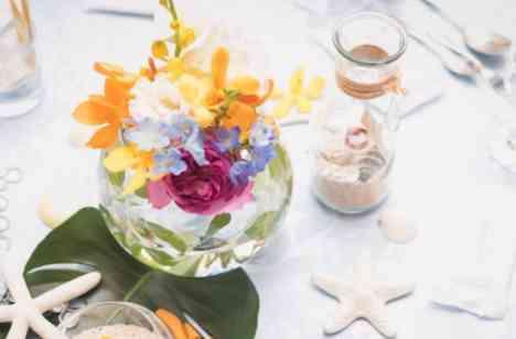「ピンク」「黄色」「白色」「青色」をテーマカラーに、夏、海、サーフっぽくリゾート感が出るようにしました。 マリッジコレクションで見た装花に一目惚れし、たまたまその装花をやった方が担当になり、一目惚れした形のままテーマに合わせた色に変えて作ってもらいました。 夏らしさを演出したくて装花もブーケもひまわりを入れてもらいました。