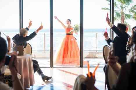 自分らしさってなんだろう?よし、好きなものを取り入れようと言うことになりました。 新婦は好きなアイドルの推しメンバーカラーのドレスをお色直しで着用し、 カラードレス色当てクイズを。 入場する際、通常の扉からではなく、海をバックにしたテラスから入場することにより、 ゲストをびっくりさせることに成功しました。