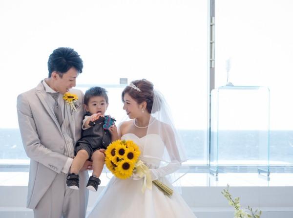 テーブルコーディネートやブーケなど全体的にリゾート感が出るようにしました。 夏の式だったので、BGMも夏らしい曲を沢山選んで使用しました♪ 子どもも参加する場面も進行の中に入れて、 来てくださったゲストにお披露目できる機会をつくったこともこだわりポイントです!